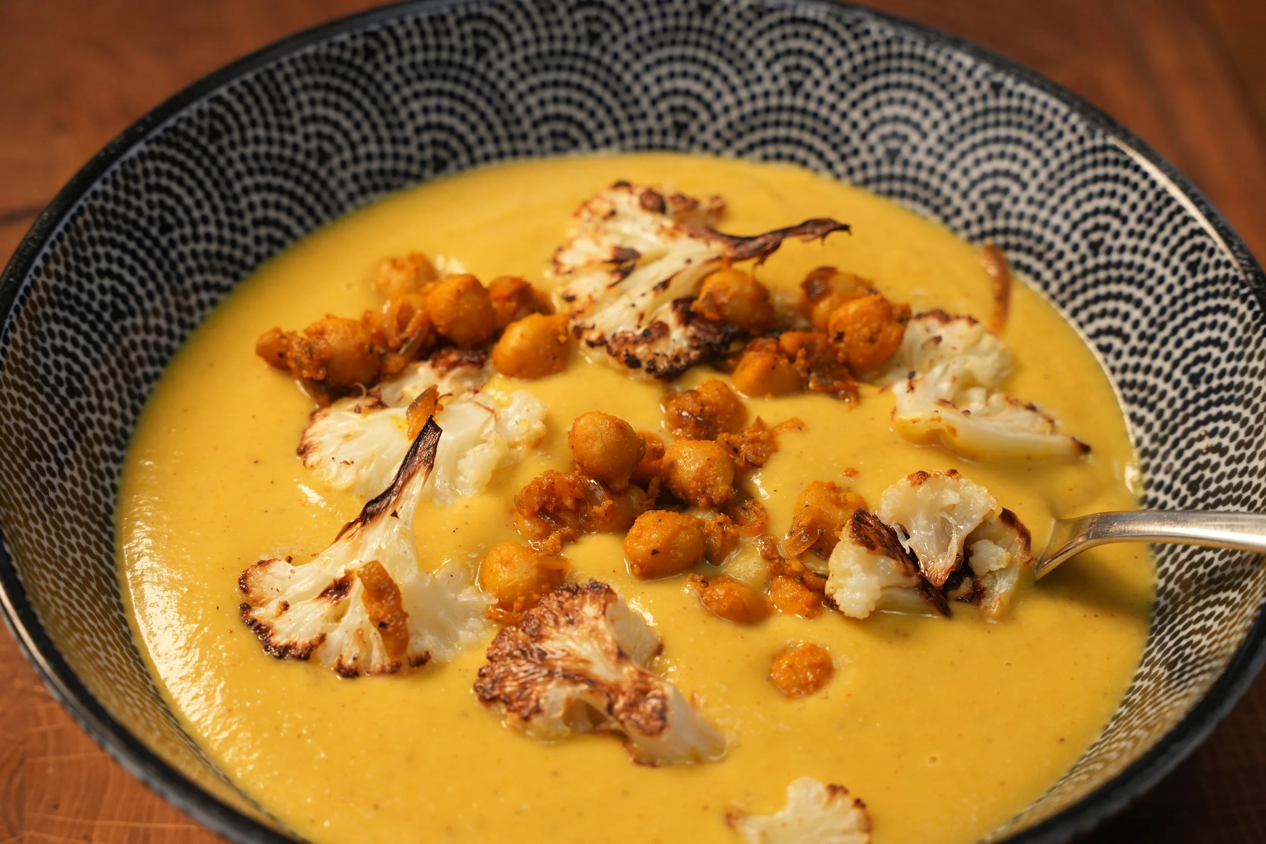 Eine Suppe, die wärmt und zugleich den Gaumen erfreut: Erlebe die Geschmacksexplosion unserer cremigen Blumenkohlsuppe mit Kichererbsen!